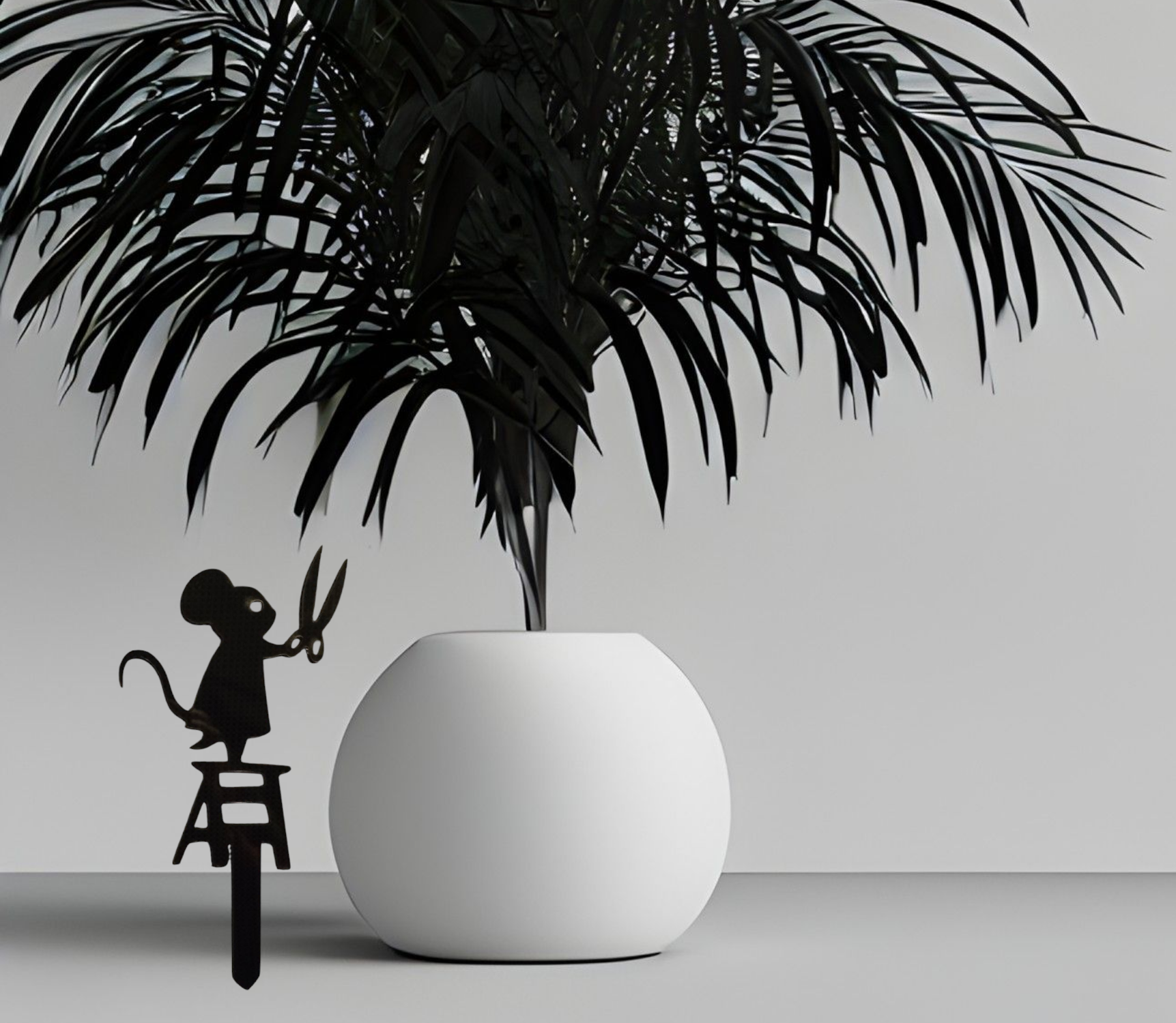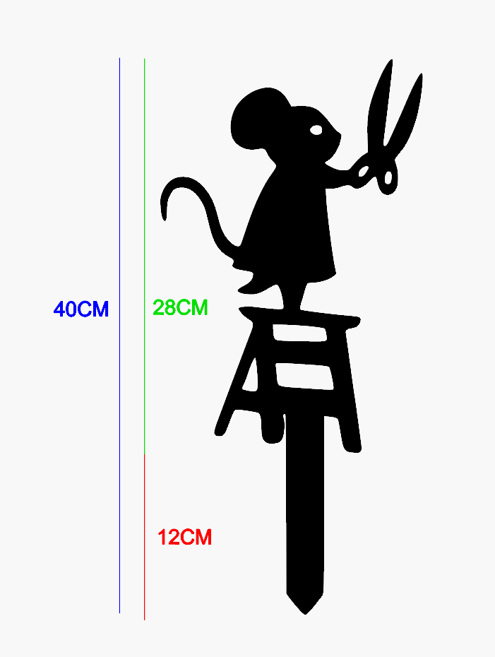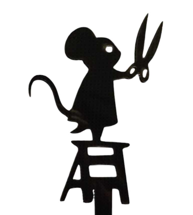 Uit plexiglas laser gesneden silhouet van een muis met een knipschaar.